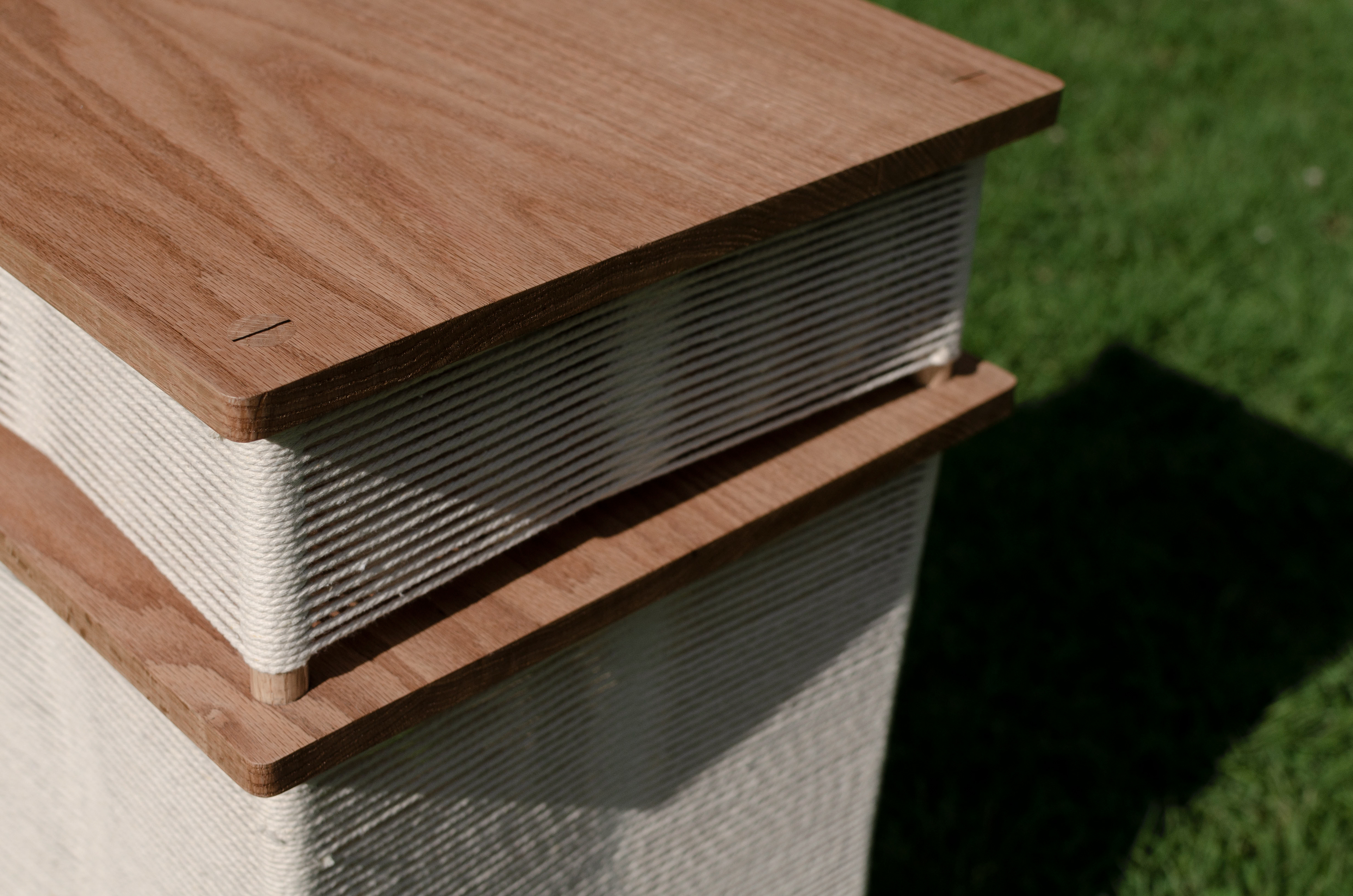 It was an opportunity to play with texture (in the unsanded, porous oakĀ and cord wrap) as well as to learn techniques (hand plane smoothing, dovetails, wedges, and drawer channels), as only hand tools were used to construct it.